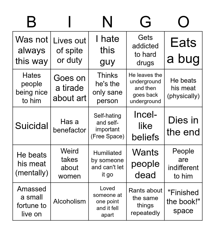This bingo card has a free space and 24 words: Weird takes about women, Alcoholism, Thinks he's the only sane person, Amassed a small fortune to live on, Eats a bug, Was not always this way, Hates people being nice to him, Lives out of spite or duty, Incel-like beliefs, Humiliated by someone and can't let it go, He leaves the underground and then goes back underground, Suicidal, Wants people dead, People are indifferent to him, Goes on a tirade about art, Rants about the same things repeatedly, Dies in the end, I hate this guy, He beats his meat (physically), Has a benefactor, "Finished the book!" space, He beats his meat (mentally), Gets addicted to hard drugs and Loved someone at one point and it fell apart.