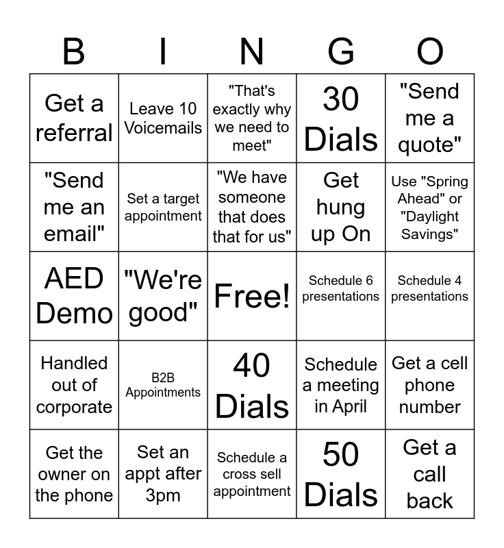 This bingo card has a free space and 24 words: B2B Appointments, Set an appt after 3pm, "We have someone that does that for us", Get the owner on the phone, "Send me a quote", Get a referral, "Send me an email", Leave 10 Voicemails, Schedule 6 presentations, 40 Dials, Get hung up On, AED Demo, Schedule a meeting in April, Get a cell phone number, Set a target appointment, 50 Dials, Schedule 4 presentations, "That's exactly why we need to meet", Use "Spring Ahead" or "Daylight Savings", "We're good", Get a call back, Handled out of corporate, 30 Dials and Schedule a cross sell appointment.