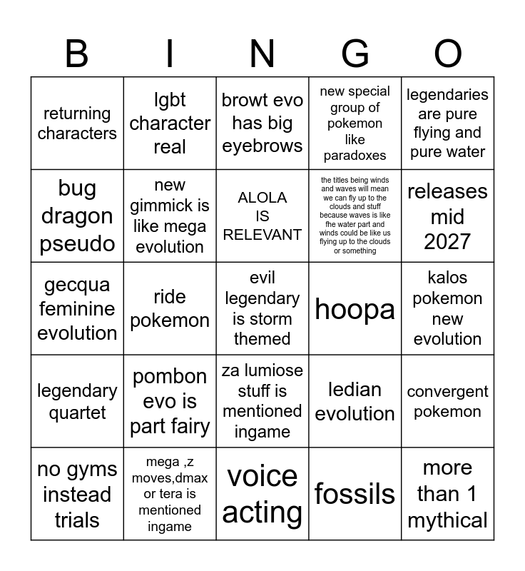 This bingo card has a free space and 24 words: pombon evo is part fairy, mega ,z moves,dmax or tera is mentioned ingame, ALOLA IS RELEVANT, no gyms instead trials, legendaries are pure flying and pure water, returning characters, bug dragon pseudo, lgbt character real, hoopa, za lumiose stuff is mentioned ingame, the titles being winds and waves will mean we can fly up to the clouds and stuff because waves is like fhe water part and winds could be like us flying up to the clouds or something, gecqua feminine evolution, ledian evolution, convergent pokemon, new gimmick is like mega evolution, fossils, kalos pokemon new evolution, browt evo has big eyebrows, releases mid 2027, ride pokemon, more than 1 mythical, legendary quartet, new special group of pokemon like paradoxes and voice acting.
