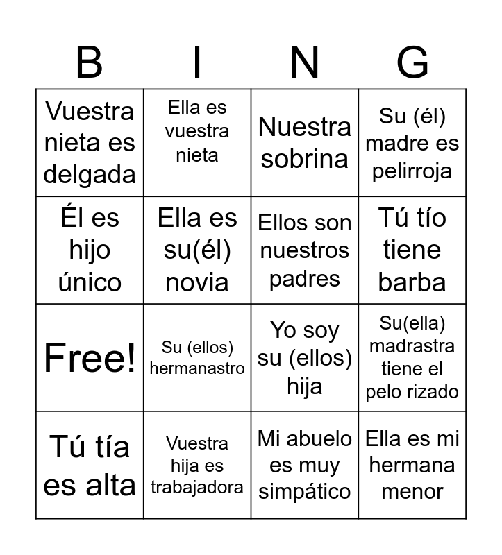 This bingo card has 20 words: Su(ella) madrastra tiene el pelo rizado, Tu hermano gemelo es tímido, Nuestra sobrina, Su (ella) hermano es rubio, Tú tía es alta, Él es hijo único, Vuestra hija es trabajadora, Vuestra nieta es delgada, Free!, Ella es vuestra nieta, Su (ellos) hermanastro, Yo soy su (ellos) hija, Ella es su(él) novia, Ella es mi hermana menor, Ellos son nuestros padres, Él es mi hermano mayor, Tú tío tiene barba, Su (él) madre es pelirroja, Mi abuelo es muy simpático and Nuestro primo tiene gafas.