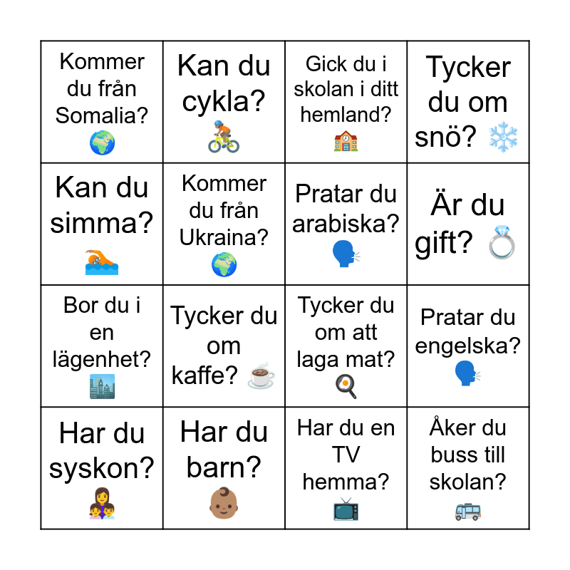 This bingo card has 16 words: Har du barn? 👶🏽, Pratar du engelska? 🗣️, Gick du i skolan i ditt hemland? 🏫, Kommer du från Somalia? 🌍, Bor du i en lägenhet? 🏙️, Kan du cykla? 🚴🏽, Tycker du om att laga mat? 🍳, Har du en TV hemma? 📺, Kan du simma? 🏊🏽, Kommer du från Ukraina? 🌍, Har du syskon? 👩👧👦, Tycker du om snö? ❄️, Tycker du om kaffe? ☕, Är du gift? 💍, Pratar du arabiska? 🗣️ and Åker du buss till skolan? 🚌.