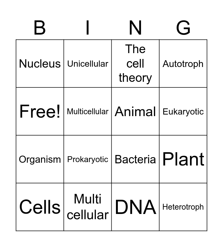 This bingo card has 16 words: Multi cellular, Plant, The cell theory, Nucleus, Organism, Unicellular, Bacteria, DNA, Free!, Multicellular, Cells, Autotroph, Prokaryotic, Eukaryotic, Animal and Heterotroph.