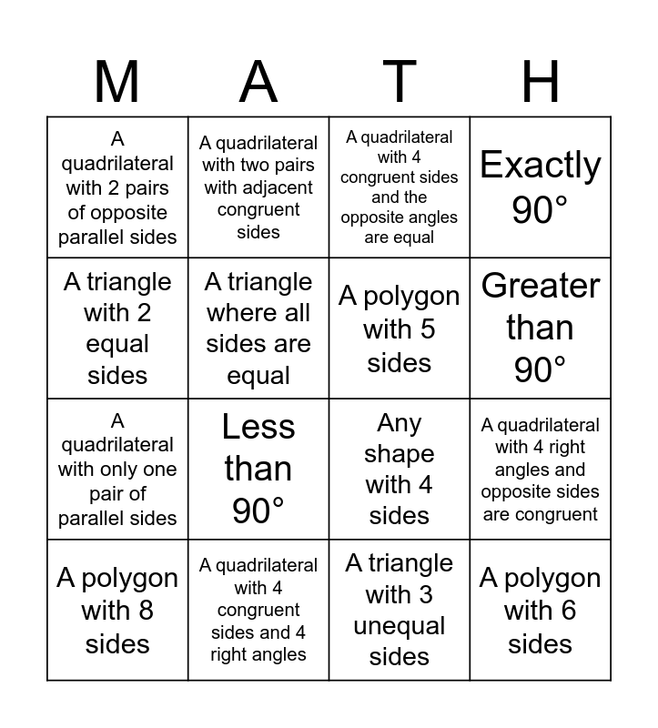 This bingo card has 16 words: A quadrilateral with 4 congruent sides and 4 right angles, A quadrilateral with 4 right angles and opposite sides are congruent, A quadrilateral with 4 congruent sides and the opposite angles are equal, A quadrilateral with 2 pairs of opposite parallel sides, A quadrilateral with only one pair of parallel sides, A quadrilateral with two pairs with adjacent congruent sides, Any shape with 4 sides, A triangle with 3 unequal sides, A triangle with 2 equal sides, A triangle where all sides are equal, A polygon with 8 sides, Exactly 90°, Less than 90°, Greater than 90°, A polygon with 5 sides and A polygon with 6 sides.