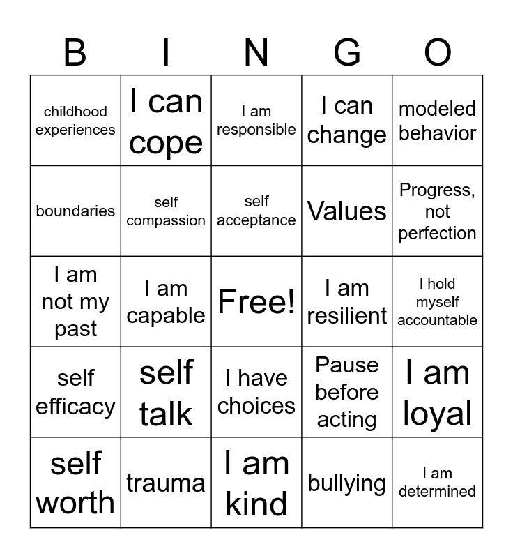 This bingo card has a free space and 29 words: self worth, I am honest, I am capable, early messages, childhood experiences, I am responsible, self compassion, self talk, I am resilient, trauma, I hold myself accountable, I am determined, I am kind, bullying, Progress, not perfection, self care, I have choices, self efficacy, modeled behavior, I am not my past, Pause before acting, Inner Strengths, Values, boundaries, I can change, I can cope, I am loyal, self acceptance and codependent.