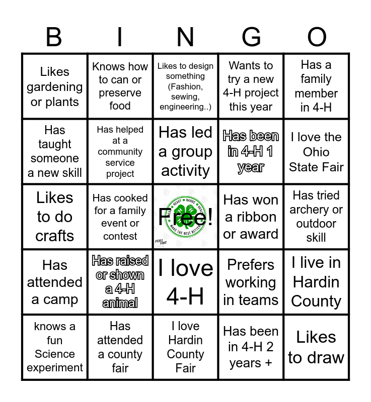 This bingo card has a free space and 24 words: Has raised or shown a 4-H animal, Has attended a county fair, Has led a group activity, knows a fun Science experiment, Has a family member in 4-H, Likes gardening or plants, Has taught someone a new skill, Knows how to can or preserve food, Has won a ribbon or award, I love 4-H, Has been in 4-H 1 year, Likes to do crafts, Prefers working in teams, I live in Hardin County, Has helped at a community service project, Has been in 4-H 2 years +, Has tried archery or outdoor skill, Likes to design something (Fashion, sewing, engineering..), I love the Ohio State Fair, Has cooked for a family event or contest, Likes to draw, Has attended a camp, Wants to try a new 4-H project this year and I love Hardin County Fair.