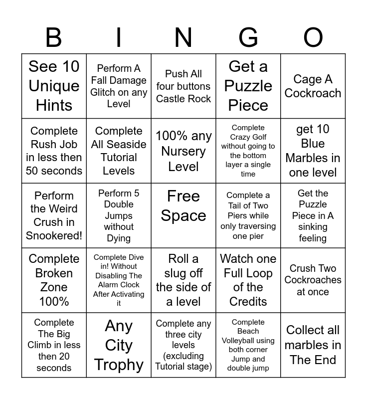 This bingo card has a free space and 24 words: Complete Dive in! Without Disabling The Alarm Clock After Activating it, Any City Trophy, 100% any Nursery Level, Complete The Big Climb in less then 20 seconds, Cage A Cockroach, See 10 Unique Hints, Complete Rush Job in less then 50 seconds, Perform A Fall Damage Glitch on any Level, Complete a Tail of Two Piers while only traversing one pier, Roll a slug off the side of a level, Complete Crazy Golf without going to the bottom layer a single time, Perform the Weird Crush in Snookered!, Watch one Full Loop of the Credits, Crush Two Cockroaches at once, Complete All Seaside Tutorial Levels, Complete Beach Volleyball using both corner Jump and double jump, Get the Puzzle Piece in A sinking feeling, Push All four buttons Castle Rock, get 10 Blue Marbles in one level, Perform 5 Double Jumps without Dying, Collect all marbles in The End, Complete Broken Zone 100%, Get a Puzzle Piece and Complete any three city levels (excluding Tutorial stage).