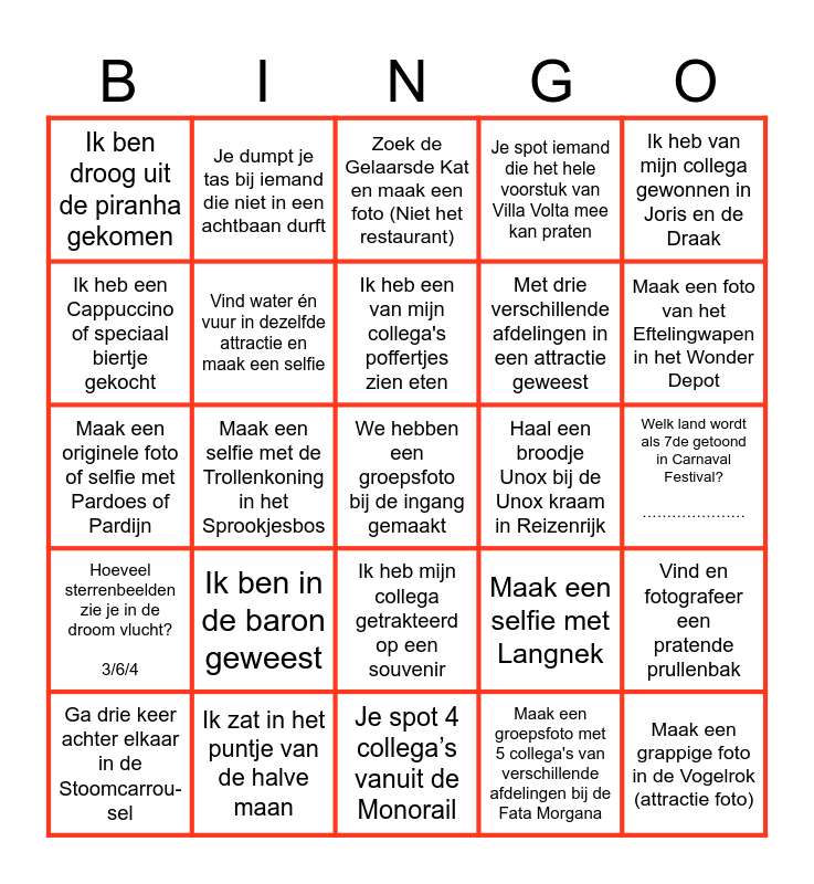 This bingo card has a free space and 24 words: Ik ben in de baron geweest, Ik zat in het puntje van de halve maan, Ik heb een van mijn collega's poffertjes zien eten, Ga drie keer achter elkaar in de Stoomcarrou-sel, Ik heb van mijn collega gewonnen in Joris en de Draak, Ik ben droog uit de piranha gekomen, Ik heb een Cappuccino of speciaal biertje gekocht, Je dumpt je tas bij iemand die niet in een achtbaan durft, Haal een broodje Unox bij de Unox kraam in Reizenrijk, Ik heb mijn collega getrakteerd op een souvenir, Met drie verschillende afdelingen in een attractie geweest, Maak een originele foto of selfie met Pardoes of Pardijn, Maak een selfie met Langnek, Vind en fotografeer een pratende prullenbak, Vind water én vuur in dezelfde attractie en maak een selfie, Maak een groepsfoto met 5 collega's van verschillende afdelingen bij de Fata Morgana, Welk land wordt als 7de getoond in Carnaval Festival? …………………, Zoek de Gelaarsde Kat en maak een foto (Niet het restaurant), Maak een foto van het Eftelingwapen in het Wonder Depot, Maak een selfie met de Trollenkoning in het Sprookjesbos, Maak een grappige foto in de Vogelrok (attractie foto), Hoeveel sterrenbeelden zie je in de droom vlucht? 3/6/4, Je spot iemand die het hele voorstuk van Villa Volta mee kan praten and Je spot 4 collega’s vanuit de Monorail.