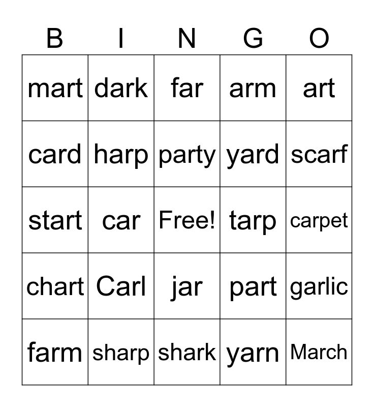 This bingo card has a free space and 29 words: farm, bark, car, star, mart, far, harp, Carl, tarp, sharp, carpet, March, shark, yarn, scarf, smart, jar, chart, art, start, part, hard, yard, card, arm, dark, garlic, party and army.