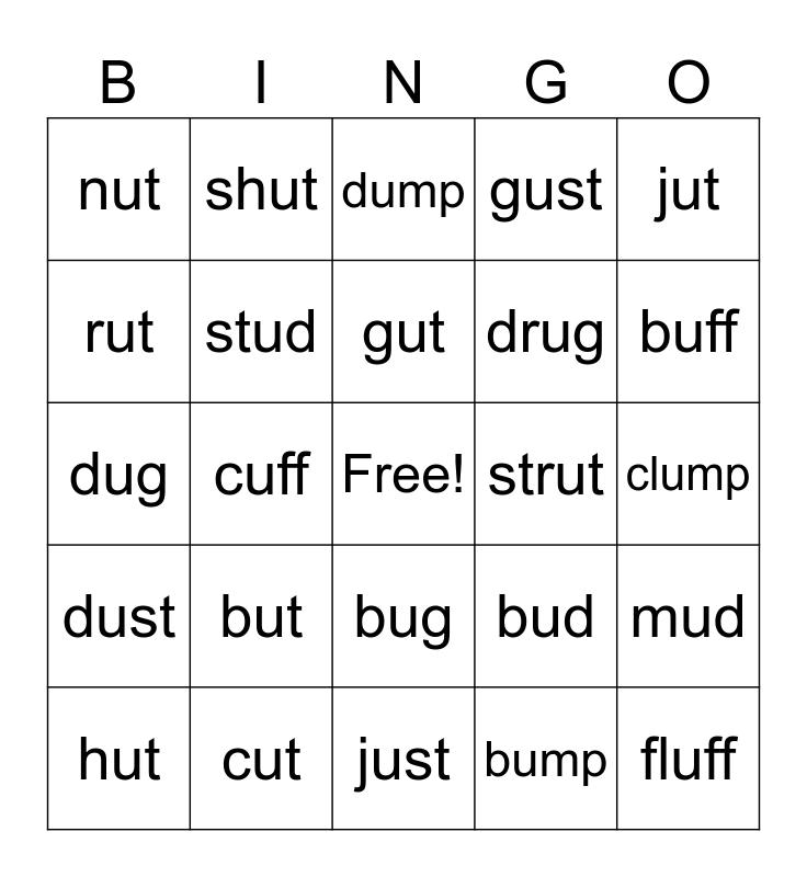 This bingo card has a free space and 24 words: but, cut, gut, hut, jut, nut, rut, shut, strut, bug, drug, dug, bud, mud, stud, bump, clump, dump, buff, cuff, fluff, dust, gust and just.