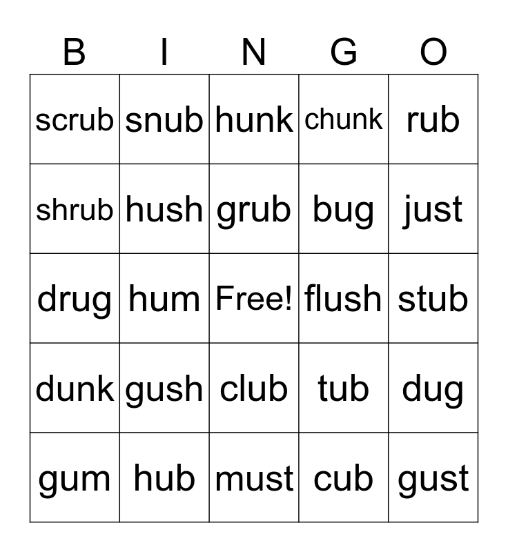 This bingo card has a free space and 26 words: club, cub, grub, hub, rub, scrub, shrub, snub, stub, tub, bug, drug, dug, gum, hum, plum, chunk, dunk, hunk, gust, just, must, flush, gush, hush and mush.