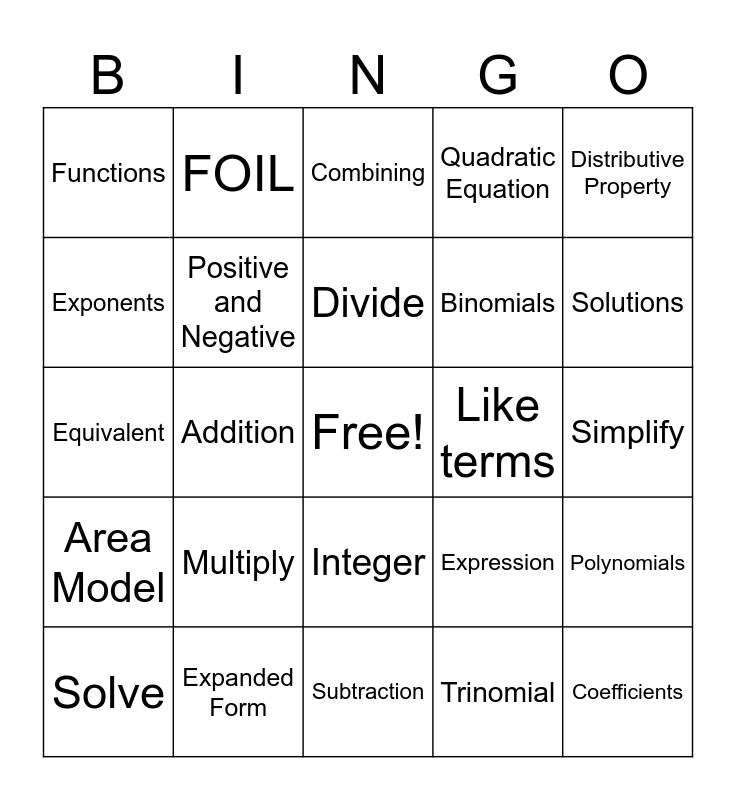 This bingo card has a free space and 24 words: Multiply, Expanded Form, Divide, Solve, Distributive Property, Functions, Exponents, FOIL, Like terms, Integer, Binomials, Equivalent, Expression, Polynomials, Positive and Negative, Trinomial, Simplify, Combining, Solutions, Addition, Coefficients, Area Model, Quadratic Equation and Subtraction.