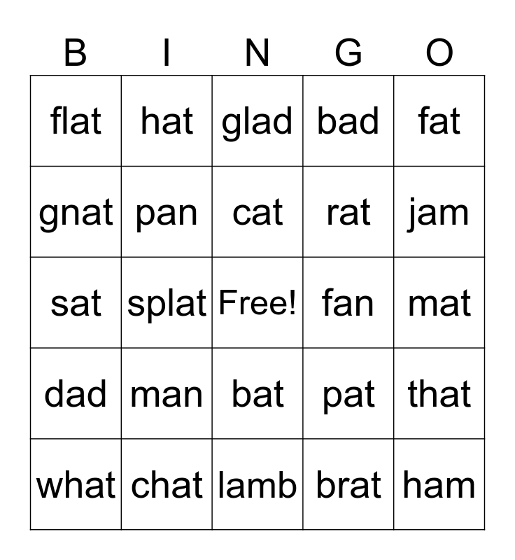 This bingo card has a free space and 26 words: bat, brat, cat, chat, fat, flat, gnat, hat, mat, pat, rat, sat, that, what, splat, sprat, bad, dad, glad, ham, jam, lamb, fan, man, pan and plan.