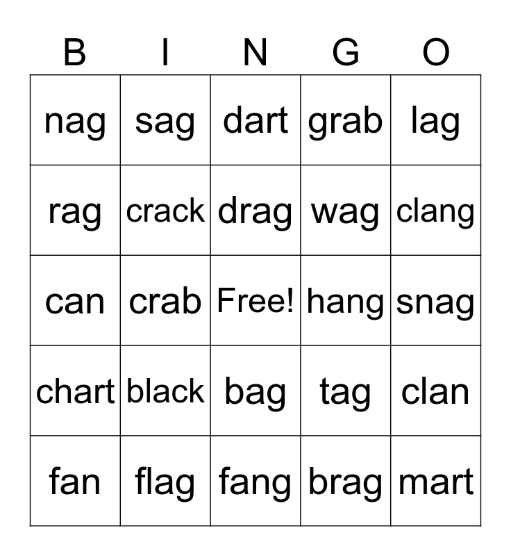 This bingo card has a free space and 26 words: bag, brag, drag, flag, lag, nag, rag, sag, snag, tag, wag, can, clan, fan, crab, dab, grab, chart, dart, mart, clang, fang, hang, black, crack and jack.