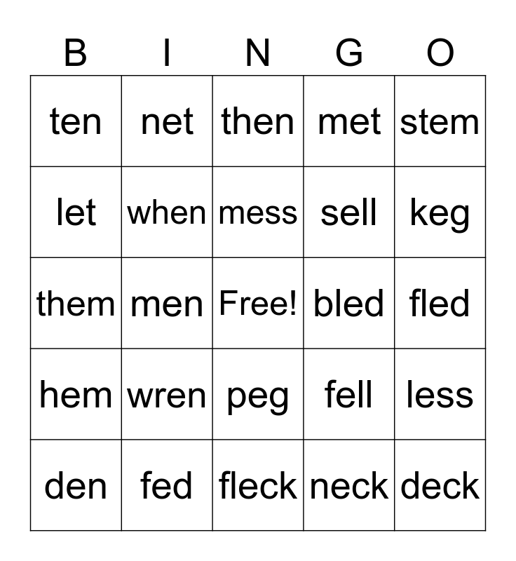 This bingo card has a free space and 29 words: den, hen, men, pen, ten, then, when, wren, bled, fed, fled, deck, fleck, neck, keg, leg, peg, hem, stem, them, fell, jell, sell, let, met, net, less, mess and press.