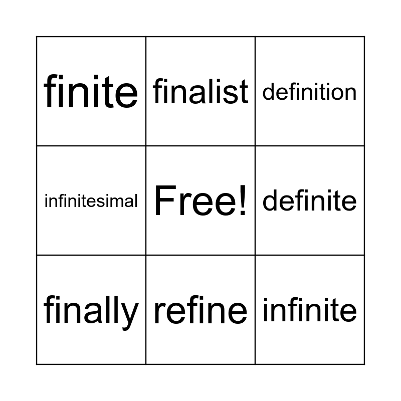This bingo card has a free space and 8 words: definite, definition, finalist, finally, finite, infinite, infinitesimal and refine.