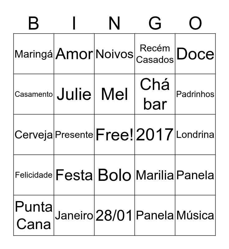 This bingo card has a free space and 27 words: Marilia, Lucas, Chá bar, 28/01, Casamento, Noivos, Amor, Felicidade, 2017, Panela, Cerveja, Recém Casados, Punta Cana, Janeiro, Padrinhos, Cacau, Julie, Mel, Festa, Maringá, Londrina, Panela, Presente, Música, Bolo, Doce and Champagne.