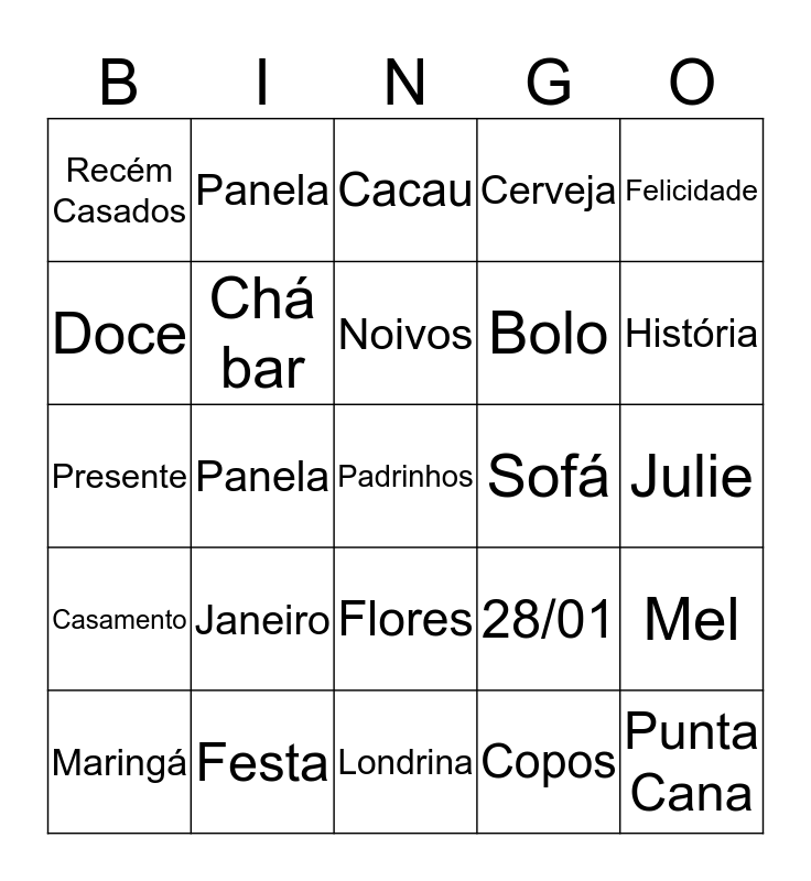 This bingo card has 36 words: Free!, Marilia, Lucas, Chá bar, 28/01, Casamento, Noivos, Amor, Felicidade, 2017, Panela, Cerveja, Fogão, Sofá, História, Recém Casados, Punta Cana, Janeiro, Padrinhos, Cacau, Julie, Mel, Festa, Maringá, Londrina, Panela, Presente, Música, Bolo, Doce, Champagne, Munhon, Copos, Flores, Casa Nova and Comida.