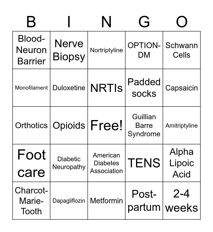 This bingo card has a free space and 25 words: Diabetic Neuropathy, Metformin, NRTIs, Charcot-Marie-Tooth, Schwann Cells, Blood-Neuron Barrier, Monofilament, Nerve Biopsy, Guillian Barre Syndrome, American Diabetes Association, Padded socks, Orthotics, TENS, Alpha Lipoic Acid, Duloxetine, Venlafaxine, Amitriptyline, Nortriptyline, Capsaicin, Opioids, 2-4 weeks, Dapagliflozin, Foot care, OPTION-DM and Post-partum.