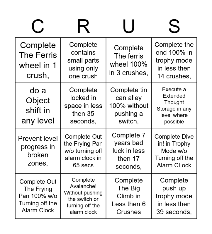 This bingo card has 22 words: Complete Avalanche! Without pushing the switch or turning off the alarm clock, Complete out the frying pan trophy mode in less then 21 crushes,, Complete contains small parts using only one crush, Complete Avalanche! In less then 30 seconds, Complete locked in space in less then 35 seconds,, Complete tin can alley 100% without pushing a switch,, Complete The Ferris wheel in 1 crush,, Complete The ferris wheel 100% in 3 crushes,, Complete 7 years bad luck in less then 17 seconds,, Complete push up trophy mode in less then 39 seconds,, Prevent level progress in broken zones,, Complete the end 100% in trophy mode in less then 14 crushes,, Complete sinking feeling in 2 crushes,, Complete dirty sheets in 2 crushes,, Complete The Big Climb in Less then 6 Crushes, Complete Gobbledygook in less then 50 seconds, Complete Dive in! in Trophy Mode w/o Turning off the Alarm CLock, Complete Out The Frying Pan 100% w/o Turning off the Alarm Clock, Complete Out the Frying Pan w/o turning off alarm clock in 65 secs, do a Object shift in any level, Execute a Extended Thought Storage in any level where possible and Complete 7 years bad luck in trophy mode in less then 60 seconds.
