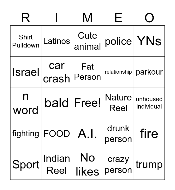 This bingo card has a free space and 24 words: FOOD, Indian Reel, Fat Person, Sport, YNs, Shirt Pulldown, Israel, Latinos, Nature Reel, A.I., relationship, n word, drunk person, fire, car crash, crazy person, unhoused individual, Cute animal, parkour, bald, trump, fighting, police and No likes.