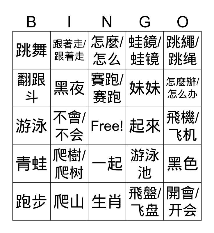 This bingo card has a free space and 24 words: 爬樹/爬树, 爬山, 賽跑/赛跑, 跑步, 跳繩/跳绳, 跳舞, 翻跟斗, 跟著走/跟着走, 起來, 一起, 妹妹, 游泳, 游泳池, 黑色, 黑夜, 飛盤/飞盘, 飛機/飞机, 怎麼/怎么, 怎麼辦/怎么办, 不會/不会, 開會/开会, 青蛙, 蛙鏡/蛙镜 and 生肖.