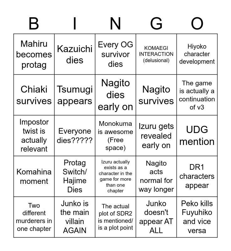 This bingo card has a free space and 24 words: Protag Switch/ Hajime Dies, Junko is the main villain AGAIN, Nagito dies early on, Two different murderers in one chapter, Hiyoko character development, Mahiru becomes protag, Chiaki survives, Kazuichi dies, Izuru gets revealed early on, Izuru actually exists as a character in the game for more than one chapter, Nagito survives, Impostor twist is actually relevant, Nagito acts normal for way longer, DR1 characters appear, Tsumugi appears, Junko doesn't appear AT ALL, UDG mention, Every OG survivor dies, The game is actually a continuation of v3, Everyone dies?????, Peko kills Fuyuhiko and vice versa, Komahina moment, KOMAEGI INTERACTION (delusional) and The actual plot of SDR2 is mentioned/ is a plot point.