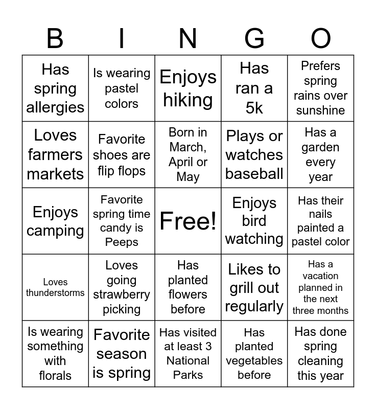 This bingo card has a free space and 26 words: Has planted flowers before, Has planted vegetables before, Born in March, April or May, Favorite season is spring, Prefers spring rains over sunshine, Has spring allergies, Loves farmers markets, Is wearing pastel colors, Has their nails painted a pastel color, Likes to grill out regularly, Plays or watches baseball, Enjoys camping, Has a vacation planned in the next three months, Is wearing something with florals, Favorite spring time candy is Peeps, Favorite spring time candy is Mini Chocolate Eggs, Has ran a 5k, Loves thunderstorms, Enjoys hiking, Has done spring cleaning this year, Has a garden every year, Has visited at least 3 National Parks, Enjoys bird watching, Loves going strawberry picking, Favorite shoes are flip flops and Loves baking spring time treats.