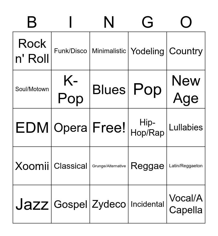 This bingo card has a free space and 24 words: Classical, Gospel, Blues, Jazz, Country, Rock n' Roll, Soul/Motown, Funk/Disco, Hip-Hop/Rap, Grunge/Alternative, Pop, EDM, Reggae, Latin/Reggaeton, K-Pop, Incidental, Lullabies, Minimalistic, New Age, Opera, Vocal/A Capella, Xoomii, Yodeling and Zydeco.