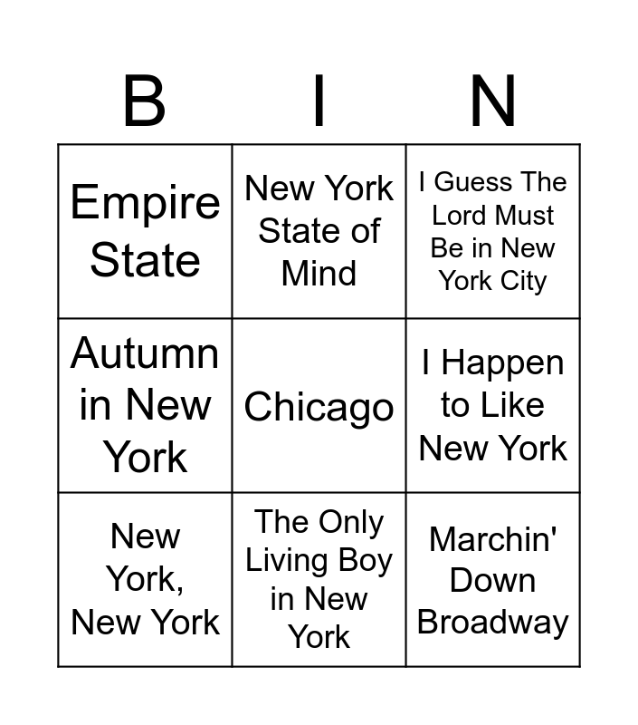 This bingo card has 9 words: New York, New York, I Guess The Lord Must Be in New York City, New York State of Mind, Autumn in New York, Empire State, I Happen to Like New York, Chicago, Marchin' Down Broadway and The Only Living Boy in New York.
