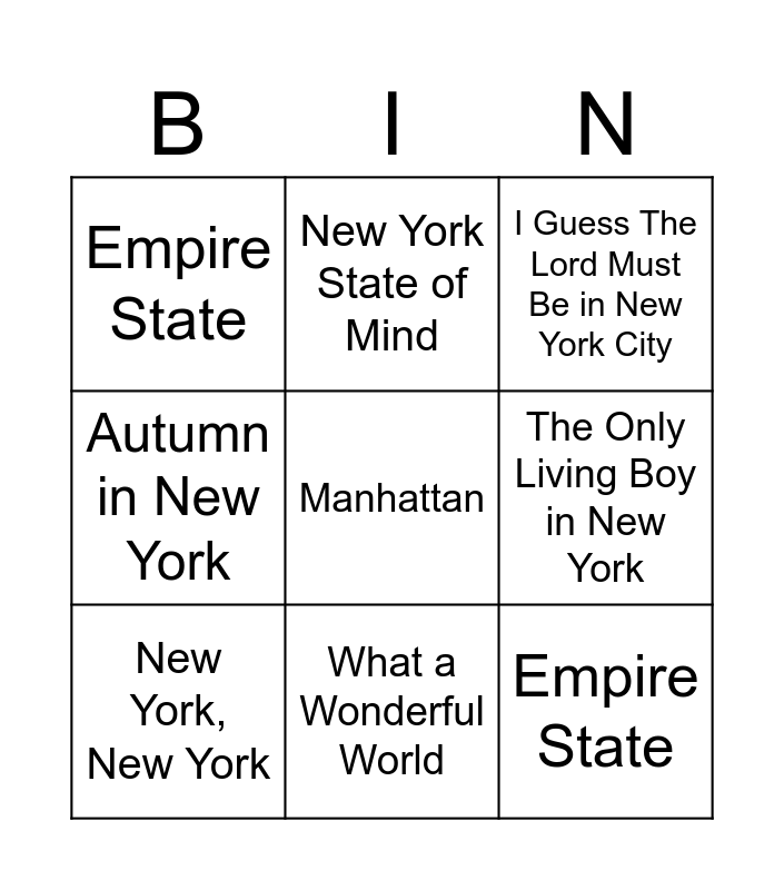 This bingo card has 9 words: New York, New York, I Guess The Lord Must Be in New York City, New York State of Mind, Autumn in New York, Empire State, The Only Living Boy in New York, Manhattan, Empire State and What a Wonderful World.