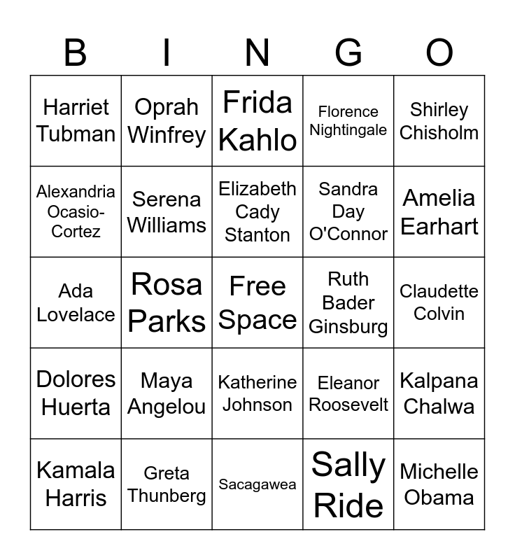 This bingo card has a free space and 29 words: Kamala Harris, Malala Yousafzi, Rosa Parks, Marie Curie, Harriet Tubman, Frida Kahlo, Serena Williams, Maya Angelou, Ruth Bader Ginsburg, Greta Thunberg, Claudette Colvin, Michelle Obama, Sacagawea, Sally Ride, Amelia Earhart, Simone Biles, Katherine Johnson, Dolores Huerta, Shirley Chisholm, Ada Lovelace, Eleanor Roosevelt, Beyonce, Sandra Day O'Connor, Alexandria Ocasio-Cortez, Florence Nightingale, Oprah Winfrey, Kalpana Chalwa, Elizabeth Cady Stanton and Gabby Douglas.
