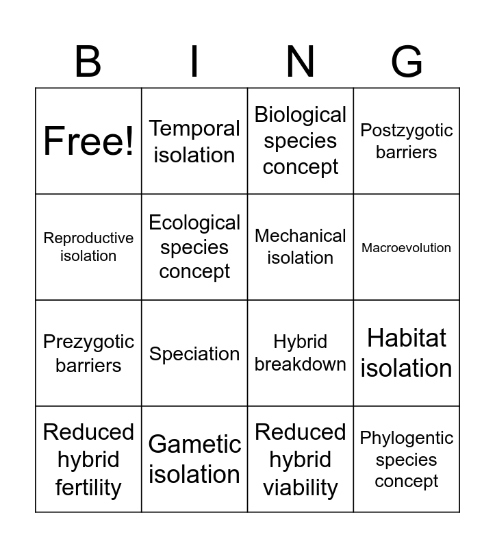 This bingo card has 20 words: Habitat isolation, Morphological species concept, Biological species concept, Microevolution, Reduced hybrid fertility, Reproductive isolation, Gametic isolation, Free!, Prezygotic barriers, Temporal isolation, Speciation, Hybrid breakdown, Ecological species concept, Phylogentic species concept, Mechanical isolation, Hybrids, Macroevolution, Postzygotic barriers, Reduced hybrid viability and Behavioral isolation.