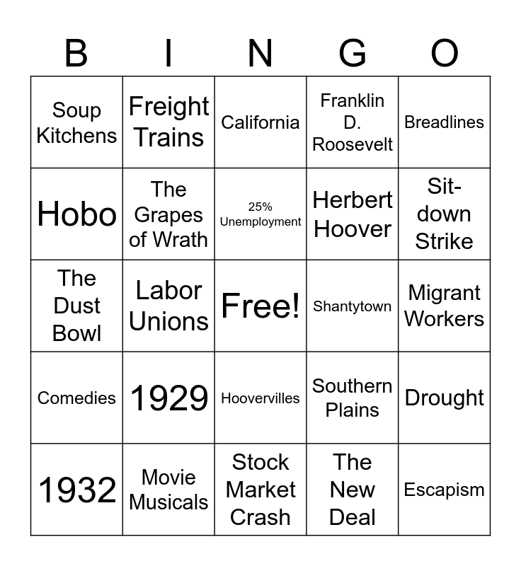 This bingo card has a free space and 25 words: 1929, Stock Market Crash, 25% Unemployment, 1932, Breadlines, Soup Kitchens, Hobo, Freight Trains, Shantytown, Hoovervilles, Herbert Hoover, The Dust Bowl, Southern Plains, Drought, The Grapes of Wrath, John Steinbeck, Migrant Workers, California, Sit-down Strike, Labor Unions, Escapism, Movie Musicals, Comedies, Franklin D. Roosevelt and The New Deal.