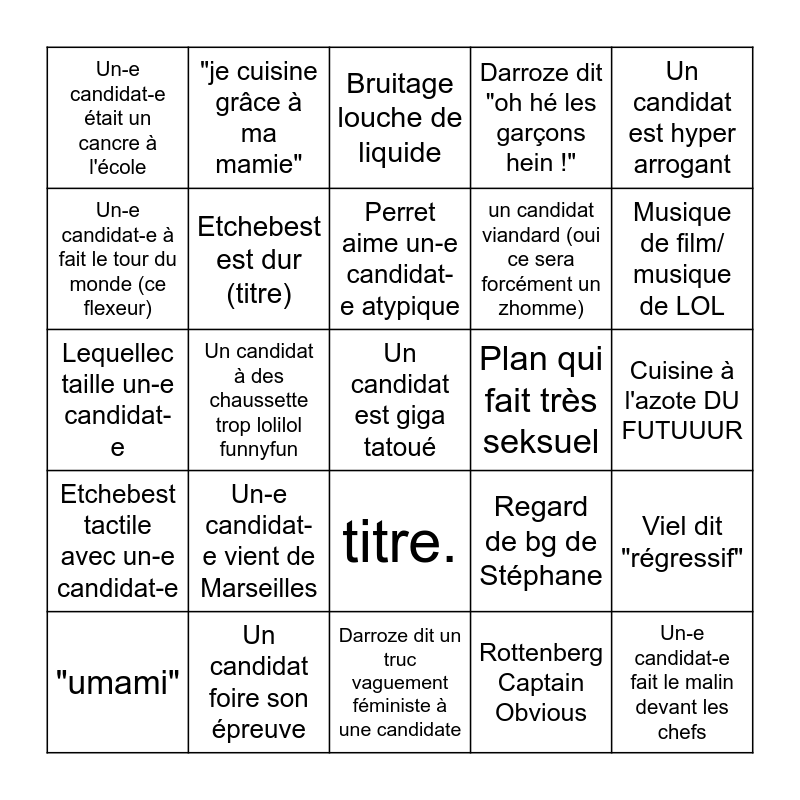 This bingo card has 25 words: Un-e candidat-e vient de Marseilles, Darroze dit un truc vaguement féministe à une candidate, Perret aime un-e candidat-e atypique, "umami", Un candidat est hyper arrogant, Un-e candidat-e était un cancre à l'école, Un-e candidat-e à fait le tour du monde (ce flexeur), "je cuisine grâce à ma mamie", Plan qui fait très seksuel, titre., un candidat viandard (oui ce sera forcément un zhomme), Lequellec taille un-e candidat-e, Regard de bg de Stéphane, Viel dit "régressif", Etchebest est dur (titre), Un-e candidat-e fait le malin devant les chefs, Cuisine à l'azote DU FUTUUUR, Bruitage louche de liquide, Musique de film/ musique de LOL, Un candidat à des chaussette trop lolilol funnyfun, Un candidat est giga tatoué, Un candidat foire son épreuve, Etchebest tactile avec un-e candidat-e, Darroze dit "oh hé les garçons hein !" and Rottenberg Captain Obvious.