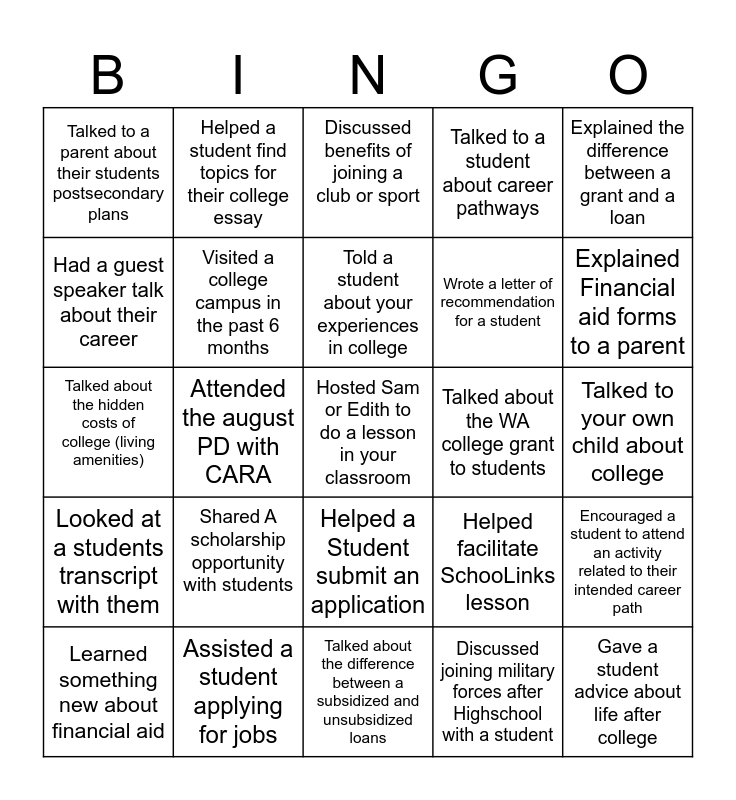 This bingo card has a free space and 39 words: Had a student show you their first college acceptance, Helped a student pick a college or postsecondary program, Helped a student with their resume, Visited a college campus in the past 6 months, Learned something new about financial aid, Helped a Student submit an application, Told a student about your experiences in college, Recommended your college to a student, Explained the difference between a grant and a loan, Looked at a students transcript with them, Attended the august PD with CARA, Talked to a student about career pathways, Gave a student advice about life after college, Talked to your own child about college, Talked about the WA college grant to students, Shared A scholarship opportunity with students, Talked to students about the WSOS, Talked to a parent about their students postsecondary plans, Provided feedback on a college or scholarship essay, Helped facilitate SchooLinks lesson, Had a guest speaker talk about their career, Talked about the difference between a subsidized and unsubsidized loans, Wrote a letter of recommendation for a student, Explained Financial aid forms to a parent, Helped a student register for an SAT or ACT, Talked about trade schools with a student, Helped a student navigate a college portal, Celebrated a students enrollment decision, Helped a student compare financial aid letters for two or more schools, Helped a student find topics for their college essay, Discussed Early decision vs Early Action, Discussed how a students hobby could become part of their career, Discussed benefits of joining a club or sport, Assisted a student applying for jobs, Discussed joining military forces after Highschool with a student, Conducted a mock interview with a student, Encouraged a student to attend an activity related to their intended career path, Talked about the hidden costs of college (living amenities) and Gave advice about balancing life after college.