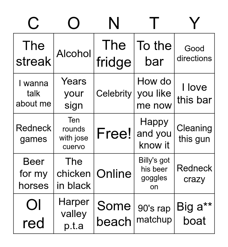 This bingo card has a free space and 34 words: People are crazy, 90's rap matchup, Kiss this, It's five o'clock somewhere, Beer for my horses, Years your sign, Good directions, Ol red, Alcohol, I'm gonna miss her, Celebrity, The fridge, Drunk drink, It's finally friday, Happy and you know it, I love this bar, Harper valley p.t.a, Redneck games, The chicken in black, Billy's got his beer goggles on, Online, Plead the fifth, The streak, Cleaning this gun, Some beach, Big a** boat, To the bar, As good as a once was, How do you like me now, I wanna talk about me, Life.\nStyles of the not so rich and famous, Ten rounds with jose cuervo, Redneck crazy and What was I thinking.