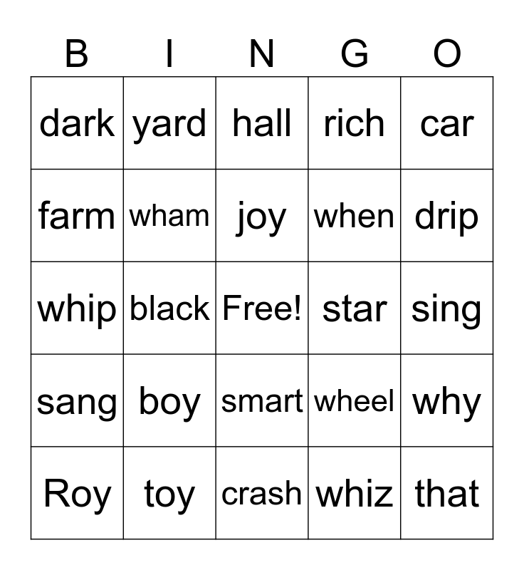This bingo card has a free space and 24 words: boy, toy, joy, Roy, car, dark, farm, yard, star, smart, when, whip, wheel, why, wham, whiz, sing, hall, drip, black, that, sang, rich and crash.