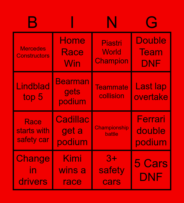 This bingo card has 16 words: Kimi wins a race, Ferrari double podium, Piastri World Champion, Mercedes Constructors, Race starts with safety car, Home Race Win, Championship battle, 3+ safety cars, Lindblad top 5, Bearman gets podium, Change in drivers, Double Team DNF, Cadillac get a podium, Last lap overtake, Teammate collision and 5 Cars DNF.