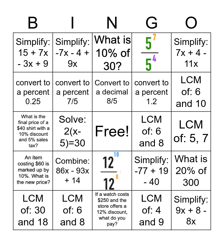 This bingo card has 13 images, a free space and 31 words: Simplify: 9x + 8 - 8x, LCM of: 30 and 18, LCM of: 4 and 9, GCF of: 40 and 32, Simplify: 7x + 4 - 11x, LCM of: 6 and 8, LCM of: 6 and 8, Combine: 86x - 93x + 14, LCM of: 25 and 40, LCM of: 7 and 9, LCM of: 6 and 10, Simplify: -7x - 4 + 9x, Definition: LCM, Simplify: 15 + 7x - 3x + 9, LCM of: 5, 7, Solve 4x+3x=4, Simplify: 2x + 3x 4x, Simplify: -77 + 19 - 40, What is 20% of 300, What is 3% of 500, Solve 2x+8=3x-4, Solve: 2(x-5)=30, Convert to a perceont 0.35%, Convert to a fraction 0.12, Convert to a decimal, Convert to a decimal 8/5, convert to a percent 0.25, convert to a percent 1.2, convert to a percent 1/2, convert to a percent 7/5 and solve 2(x-2)=3x+4.