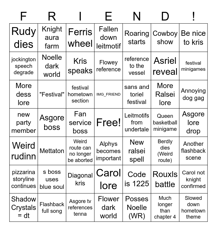 This bingo card has a free space and 48 words: Code is 1225, Asriel reveal, Flower dark world, Asgore boss, festival hometown section, Asgore lore drop, Knight aura farm, Flashback full song, Cowboy show, Alphys becomes important, Be nice to kris, Fallen down leitmotif, More Ralsei lore, sans and toriel festival, pizzarina storyline continues, Queen basketball minigame, jockington speech degrade, festival minigames, Rouxls battle, Roaring starts, reference to the vessel, Fan service boss, Rudy dies, Noelle dark world, Carol not knight confirmed, Kris speaks, Annoying dog gag, Shadow Crystals = dt, IMG_FRIEND, "Festival", Much longer than chapter 4, Leitmotifs from undertale, Another flashback scene, s boss uses blue soul, new party member, New ralsei spell, Berdly dies (Weird route), More dess lore, Weird route can no longer be aborted, Diagonal kris, Weird rudinn, Slowed down hometown theme, Ferris wheel, Asgore tv references tenna, Flowey reference, Carol lore, Mettaton and Posses Noelle (WR).