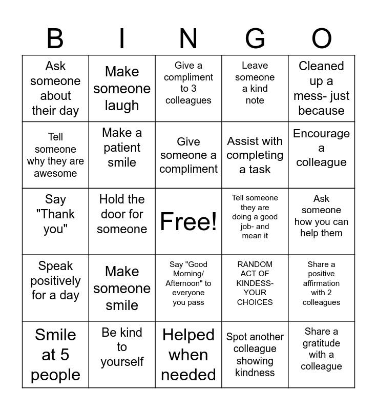 This bingo card has a free space and 25 words: Make someone smile, Helped when needed, Give someone a compliment, Smile at 5 people, Cleaned up a mess- just because, Ask someone about their day, Tell someone why they are awesome, Make someone laugh, Tell someone they are doing a good job- and mean it, Say "Good Morning/ Afternoon" to everyone you pass, Assist with completing a task, Say "Thank you", RANDOM ACT OF KINDESS- YOUR CHOICES, Share a positive affirmation with 2 colleagues, Make a patient smile, Tell a colleague why you appreciate them, Ask someone how you can help them, Give a compliment to 3 colleagues, Encourage a colleague, Hold the door for someone, Share a gratitude with a colleague, Be kind to yourself, Speak positively for a day, Leave someone a kind note and Spot another colleague showing kindness.