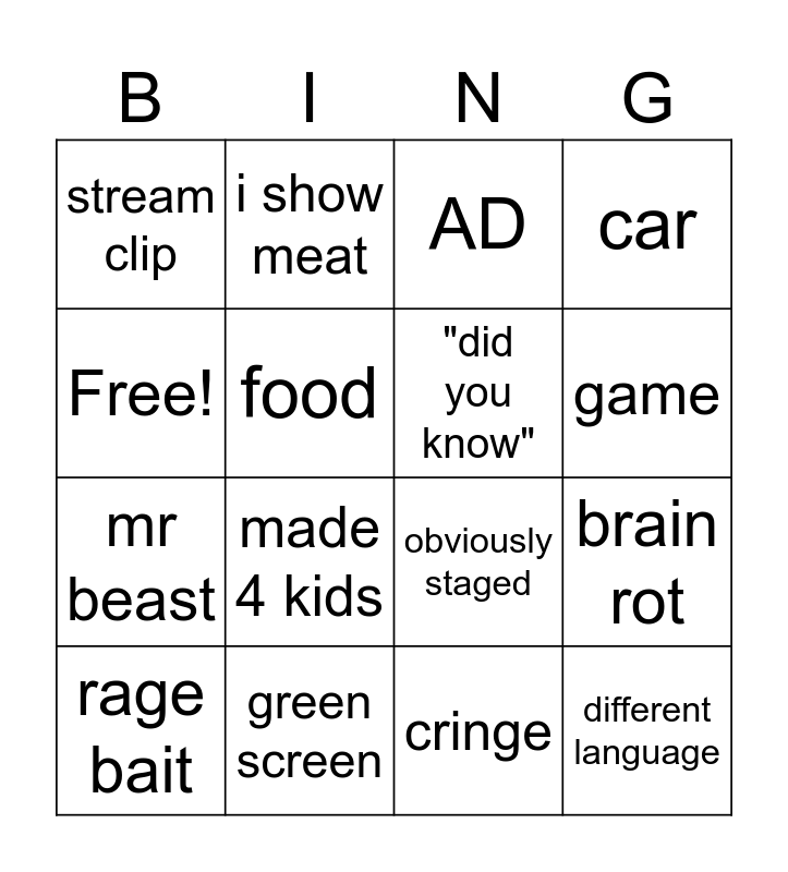 This bingo card has 16 words: green screen, brain rot, AD, stream clip, mr beast, i show meat, obviously staged, cringe, Free!, food, rage bait, car, made 4 kids, game, "did you know" and different language.