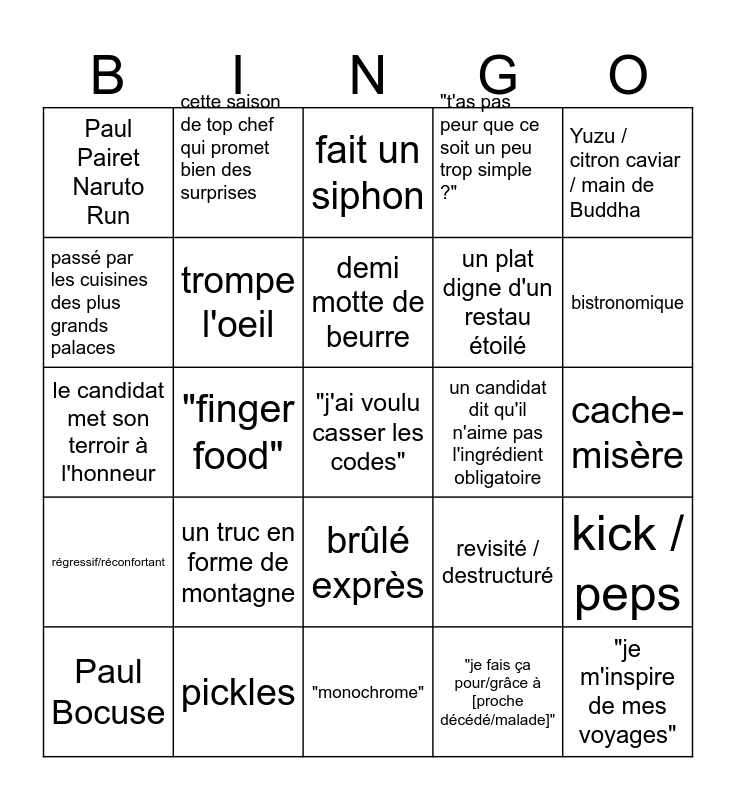 This bingo card has a free space and 29 words: Paul Bocuse, "street food", "finger food", "sexy" / allusion sexuelle, Paul Pairet Naruto Run, fait un siphon, trompe l'oeil, un truc en forme de montagne, un candidat dit qu'il n'aime pas l'ingrédient obligatoire, pickles, cache-misère, "je m'inspire de mes voyages", "monochrome", "je fais ça pour/grâce à [proche décédé/malade]", bistronomique, [chef mentionné] "lui/elle c'est une légende, je l'admire" (ou variation), brûlé exprès, régressif/réconfortant, Yuzu / citron caviar / main de Buddha, le candidat met son terroir à l'honneur, revisité / destructuré, candidat foire mais s'en sort, un plat digne d'un restau étoilé, passé par les cuisines des plus grands palaces, "t'as pas peur que ce soit un peu trop simple ?", cette saison de top chef qui promet bien des surprises, kick / peps, demi motte de beurre and Stéphane a l'air sur le point de dévorer l'assiette.