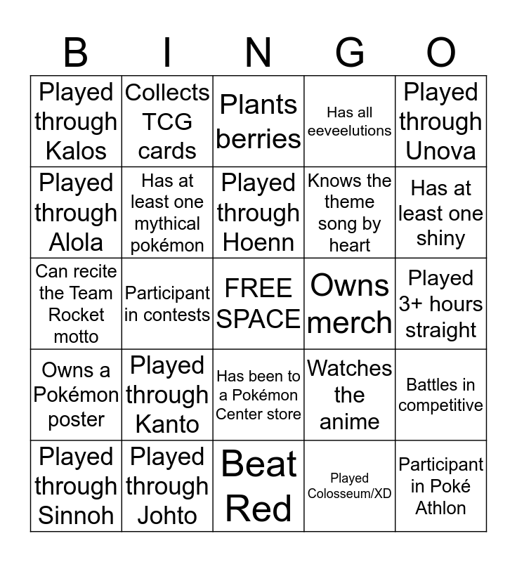 This bingo card has a free space and 24 words: Played through Kanto, Played through Johto, Played through Hoenn, Played through Sinnoh, Played through Unova, Played through Kalos, Played through Alola, Collects TCG cards, Owns merch, Has been to a Pokémon Center store, Knows the theme song by heart, Can recite the Team Rocket motto, Watches the anime, Battles in competitive, Has at least one mythical pokémon, Played Colosseum/XD, Played 3+ hours straight, Plants berries, Has at least one shiny, Participant in contests, Participant in Poké Athlon, Owns a Pokémon poster, Has all eeveelutions and Beat Red.