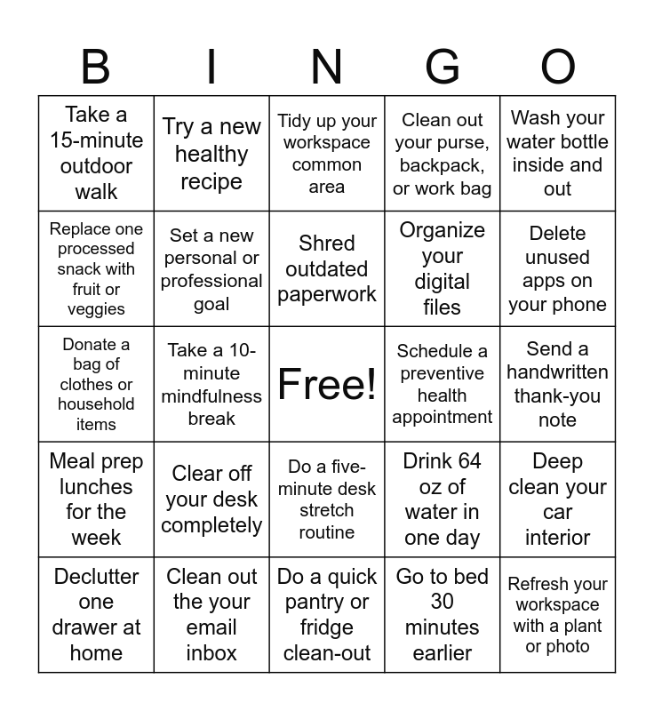 This bingo card has a free space and 24 words: Clear off your desk completely, Clean out the your email inbox, Shred outdated paperwork, Declutter one drawer at home, Wash your water bottle inside and out, Take a 15-minute outdoor walk, Replace one processed snack with fruit or veggies, Try a new healthy recipe, Schedule a preventive health appointment, Do a five-minute desk stretch routine, Organize your digital files, Donate a bag of clothes or household items, Drink 64 oz of water in one day, Deep clean your car interior, Set a new personal or professional goal, Go to bed 30 minutes earlier, Send a handwritten thank-you note, Tidy up your workspace common area, Delete unused apps on your phone, Take a 10-minute mindfulness break, Refresh your workspace with a plant or photo, Meal prep lunches for the week, Clean out your purse, backpack, or work bag and Do a quick pantry or fridge clean-out.