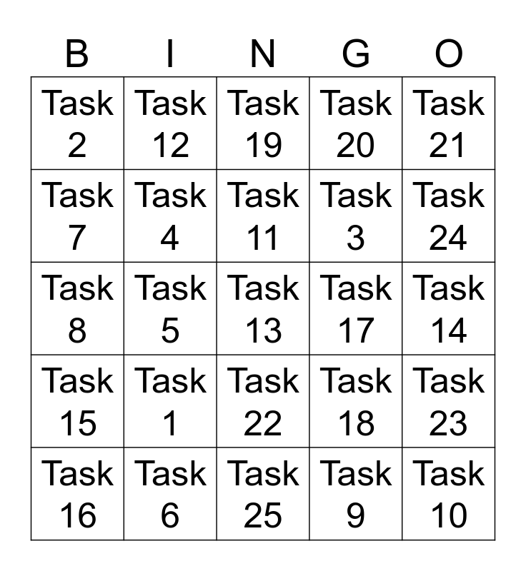 This bingo card has a free space and 24 words: Task 1, Task 6, Task 11, Task 16, Task 21, Task 2, Task 7, Task 12, Task 17, Task 22, Task 3, Task 8, Task 18, Task 23, Task 4, Task 9, Task 14, Task 19, Task 24, Task 5, Task 10, Task 15, Task 20 and Task 25.