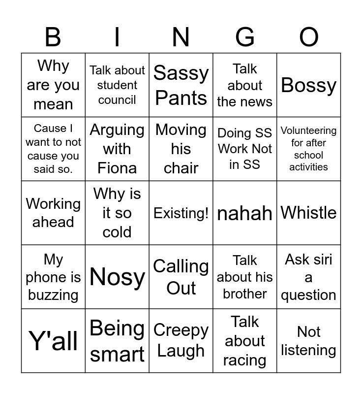 This bingo card has a free space and 24 words: Nosy, Being smart, Moving his chair, Y'all, Bossy, Why are you mean, Cause I want to not cause you said so., Talk about student council, nahah, Calling Out, Doing SS Work Not in SS, Working ahead, Talk about his brother, Ask siri a question, Arguing with Fiona, Talk about racing, Whistle, Sassy Pants, Volunteering for after school activities, Why is it so cold, Not listening, My phone is buzzing, Talk about the news and Creepy Laugh.