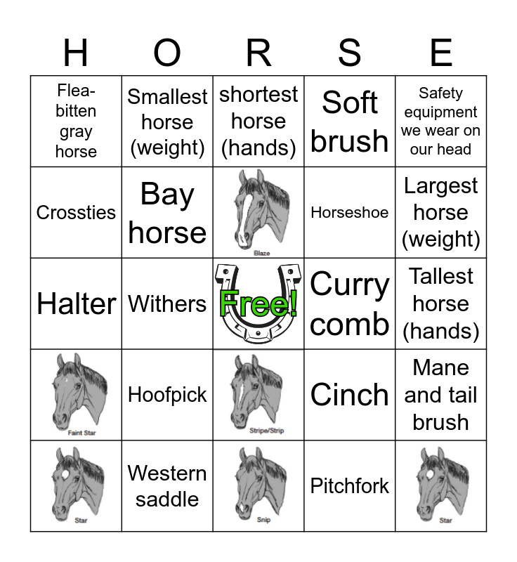 This bingo card has 7 images, a free space and 27 words: Pitchfork, Hay Shed, A horse named Feather, Bay horse, Safety equipment we wear on our head, Smallest horse (weight), Piece of tack we put on our horse's head when we ride, shortest horse (hands), English saddle, Paint horse, Curry comb, Largest horse (weight), Western saddle, Halter, Hoofpick, Cinch, Feed room, Flea-bitten gray horse, Tallest horse (hands), Soft brush, Saddle pad, Horseshoe, Crossties, Wash stall, Withers, Mane and tail brush and Chestnut horse.