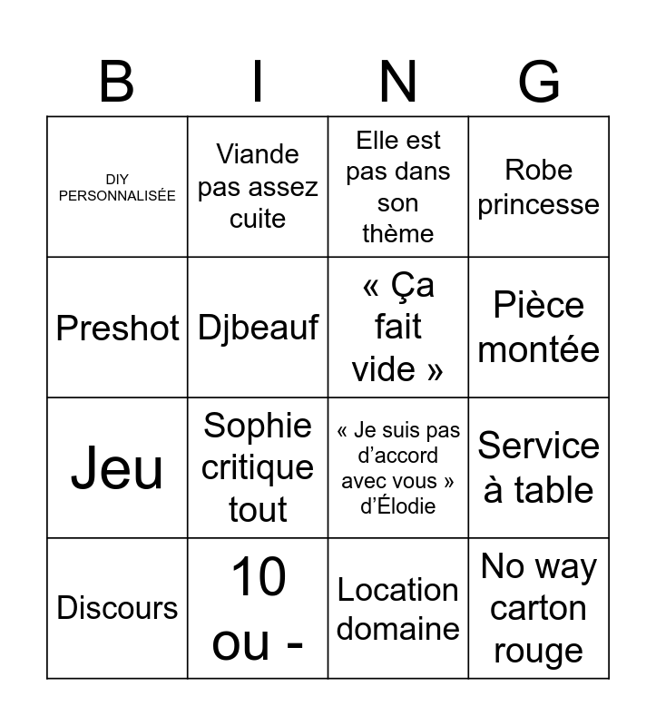 This bingo card has 16 words: 10 ou -, Service à table, Elle est pas dans son thème, DIY PERSONNALISÉE, Jeu, Viande pas assez cuite, « Je suis pas d’accord avec vous » d’Élodie, Location domaine, Preshot, Djbeauf, Discours, Robe princesse, Sophie critique tout, Pièce montée, « Ça fait vide » and No way carton rouge.