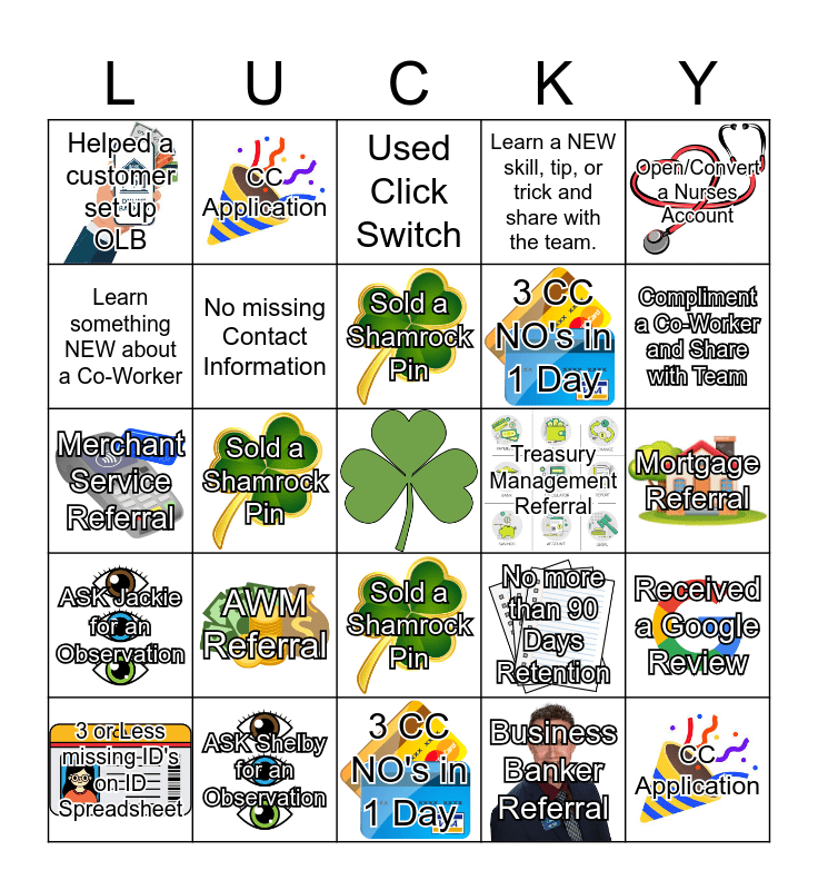 This bingo card has 19 images, a free space and 24 words: AWM Referral, ASK Shelby for an Observation, Sold a Shamrock Pin, 3 or Less missing ID's on ID Spreadsheet, Open/Convert a Nurses Account, Helped a customer set up OLB, Learn something NEW about a Co-Worker, CC Application, Treasury Management Referral, Sold a Shamrock Pin, 3 CC NO's in 1 Day, Merchant Service Referral, No more than 90 Days Retention, Received a Google Review, No missing Contact Information, Business Banker Referral, Mortgage Referral, Used Click Switch, Compliment a Co-Worker and Share with Team, Sold a Shamrock Pin, CC Application, ASK Jackie for an Observation, Learn a NEW skill, tip, or trick and share with the team. and 3 CC NO's in 1 Day.